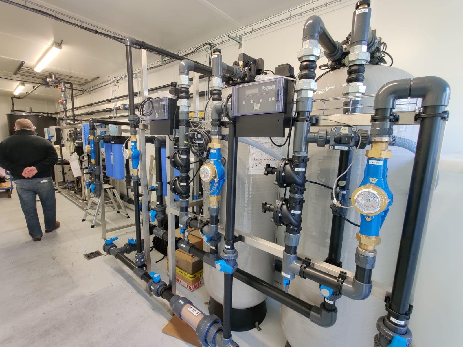 Voici des photographies de l’intérieur et l’extérieur de nos conteneurs osmoseur. Leur fonction est de produire de l’eau très pure débarrassée de toutes les scories et composants que l’on trouve habituellement dans l’eau de ville. Cette eau servira dans le processus de refroidissement adiabatique au cœur des centrales de traitement d’air qui refroidissent le datacenter.
