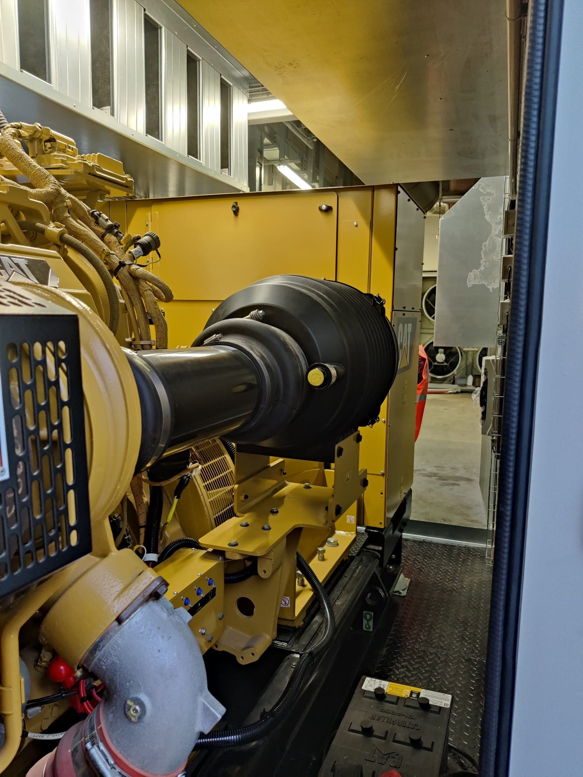Le moteur jaune est l’intérieur d’un container groupe électrogène et on voit le groupe électrogène dans sa longueur. En première phase, nous aurons 4 groupes électrogènes pour secourir l’alimentation électrique du site. En cas de panne électrique du réseau primaire, ils prennent le relai en moins de 30 secondes. Nous avons de plus 72h d’autonomie sur chacun des groupes.